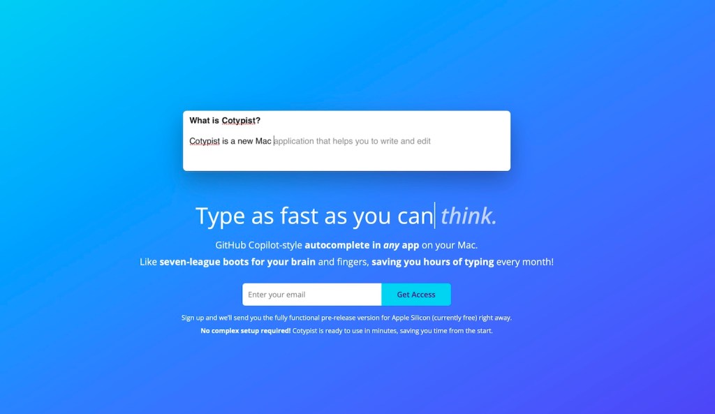 Cotypist is an AI writing app for Mac that helps you type faster by predicting and auto-completing your words as you write. It's like having an assistant that knows what you want to say next, helping you write emails, documents, and messages faster while maintaining your natural writing style.