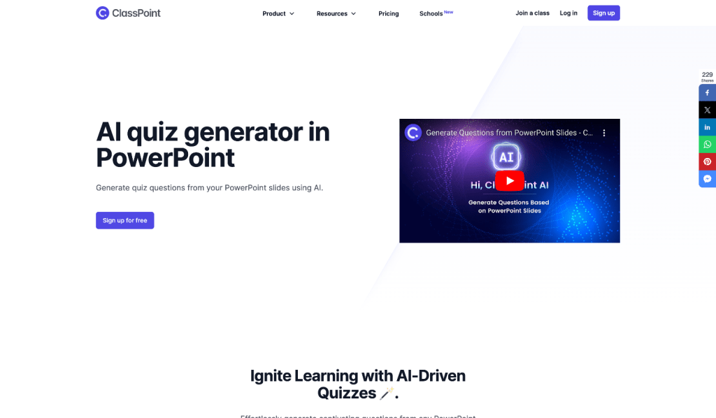 ClassPoint AI is an AI-powered feature within PowerPoint that enables users to generate quiz questions directly from their slides. It offers various quiz types like multiple-choice, short answer, and fill-in-the-blanks, utilizing Bloom's taxonomy for question generation.