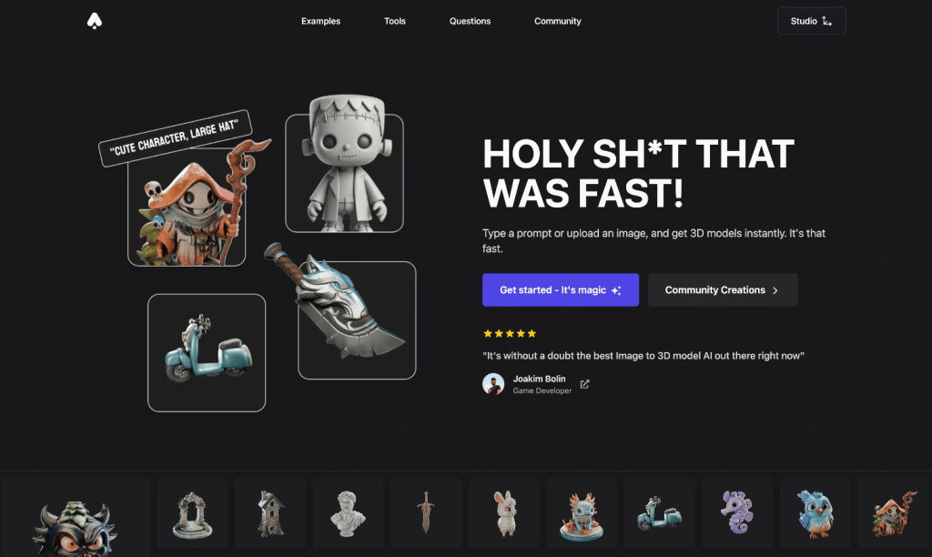 - Functionality: The platform includes a community section for users to showcase and explore 3D creations. Additionally, an API allows integration of 3D generation into other applications.