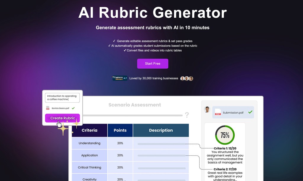 The AI Rubric Generator from Coursebox.ai allows users to create assessment rubrics in about 10 minutes. It automatically generates editable rubrics, sets pass grades, and can grade student submissions based on the rubric.
