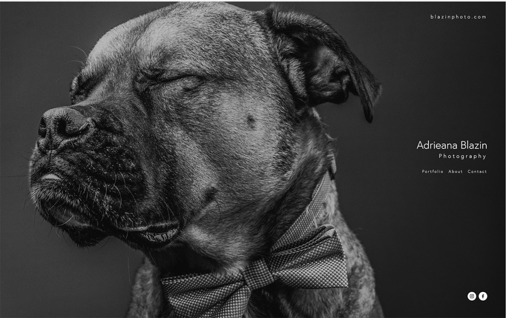 Once you click on the portfolio section it opens to a new page where you can pick from three navigations, people, pets, and in-studio work. You can preview her work in slider mode or view it in grid thumbnails.