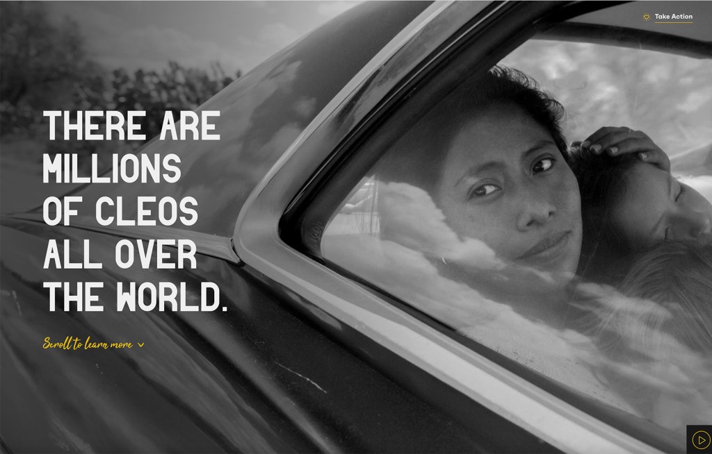 Roma is a single-page website focused on the exploitation of domestic workers and their stories and the journey they went through. Once you enter the website there is a large full-width black-and-white image of women with their children with a powerful bold statement.