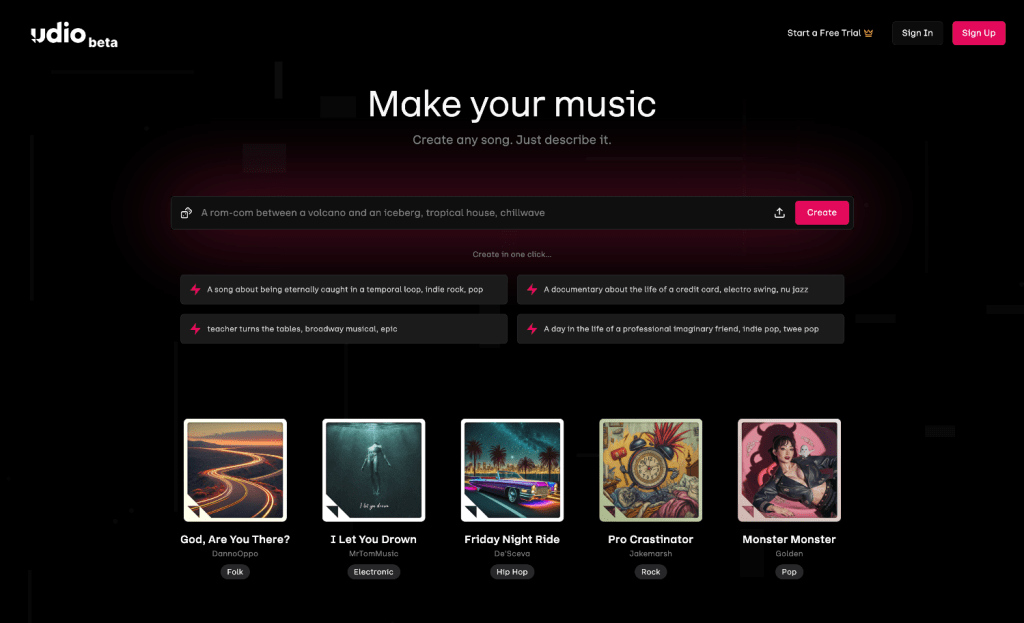 Tracks created on Udio can be published and shared within the platform, making it a versatile tool for both hobbyists and professional musicians
